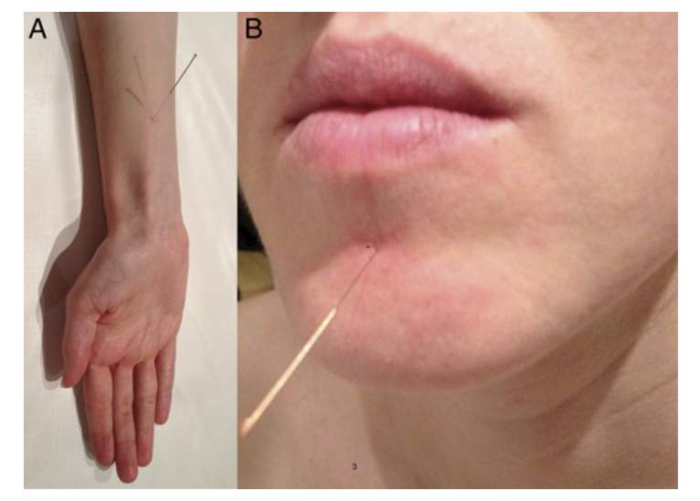 These are the specific Acupuncture points PC 6 and CV 24, which have anecdotally been described to reduce the gag reflex in patients having dental procedures.