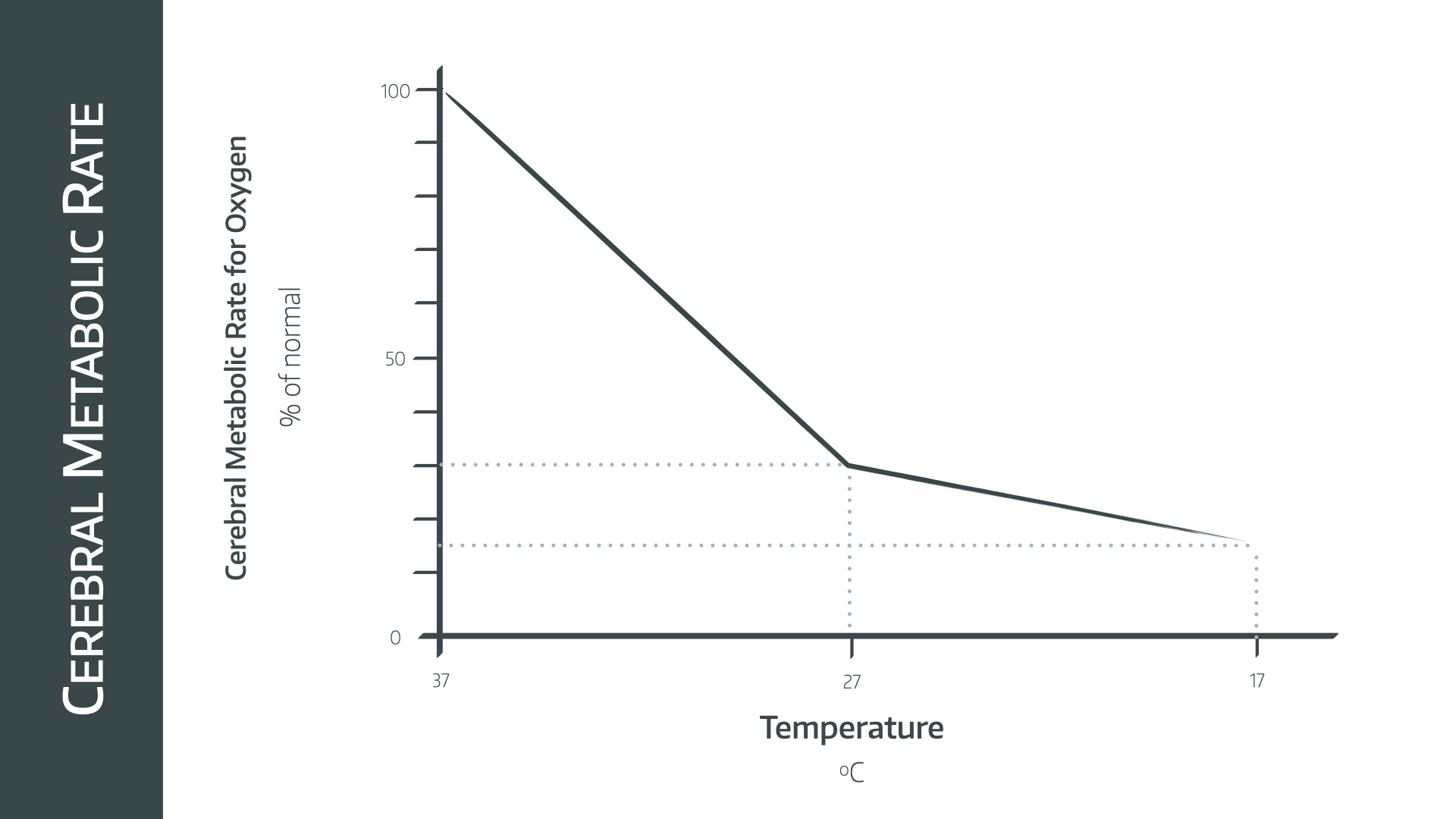 As temperature decreases CMRO2 decreases, which is part of the rationale behind targeted temperature management in out of hospital arrest patients. The graph has two linear segments, changing gradient at 27°C.