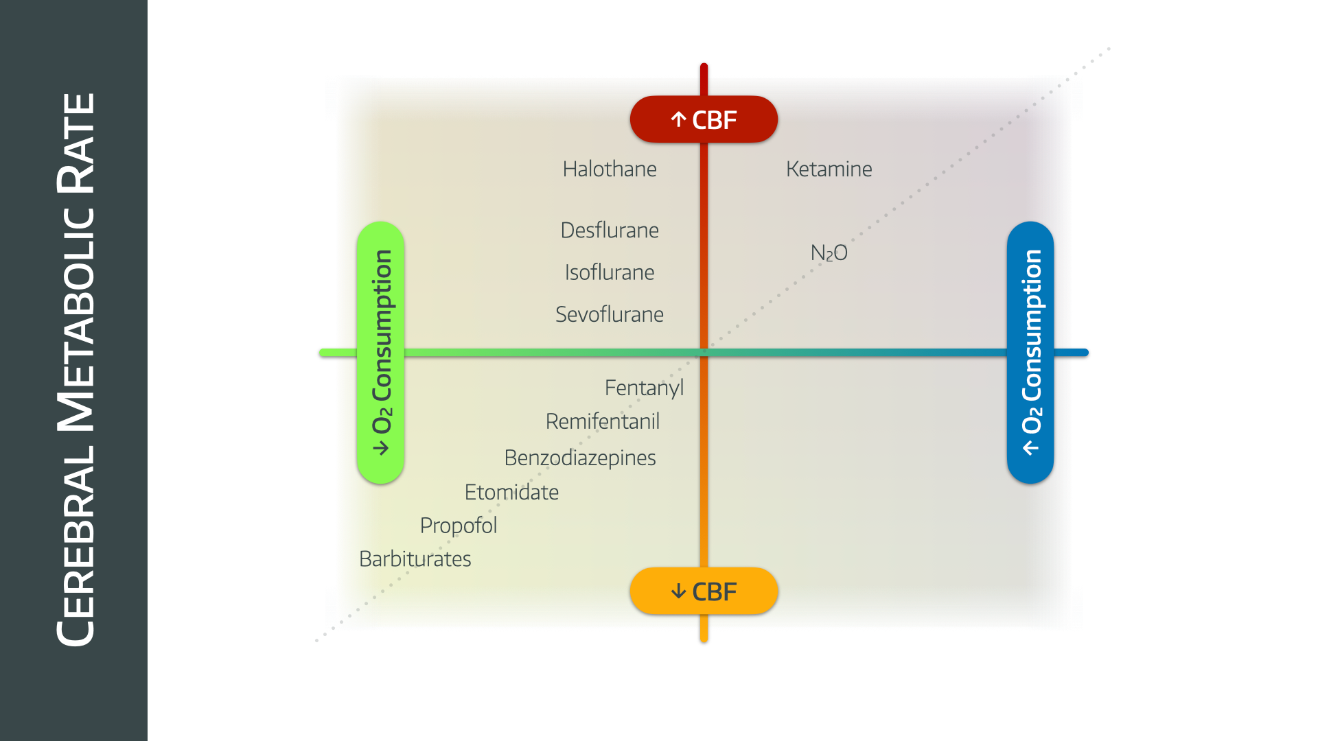 Propofol and Thiopentone reduce CMRO2 and cerebral blood flow. Ketamine increases CMRO2 and cerebral blood flow, but flow to a greater extent. It is generally avoided in patients with raised intracranial pressure however it is often used for head trauma patients where cardiovascular stability is the priority.