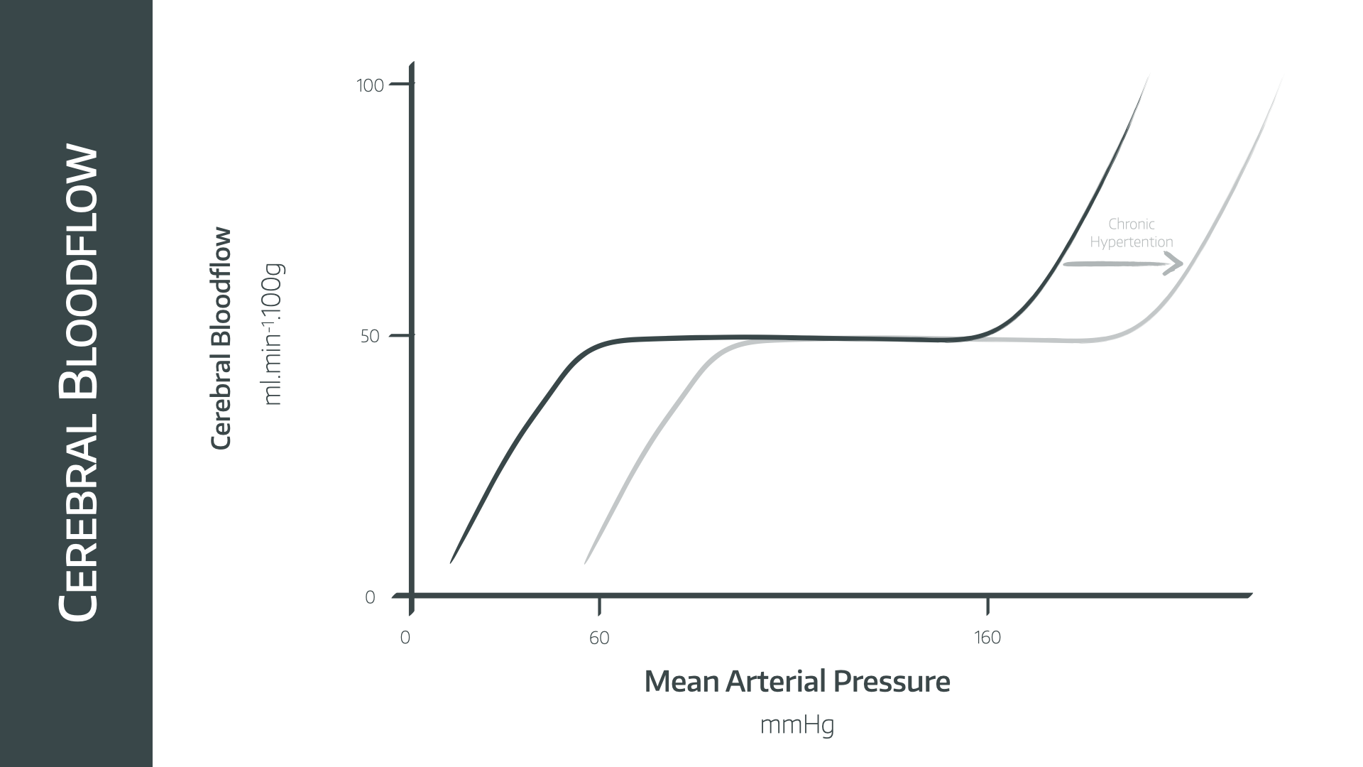 This graph shifts to the right in chronic hypertension, emphasising the importance of maintaining sufficient MAP in known hypertensive patients.