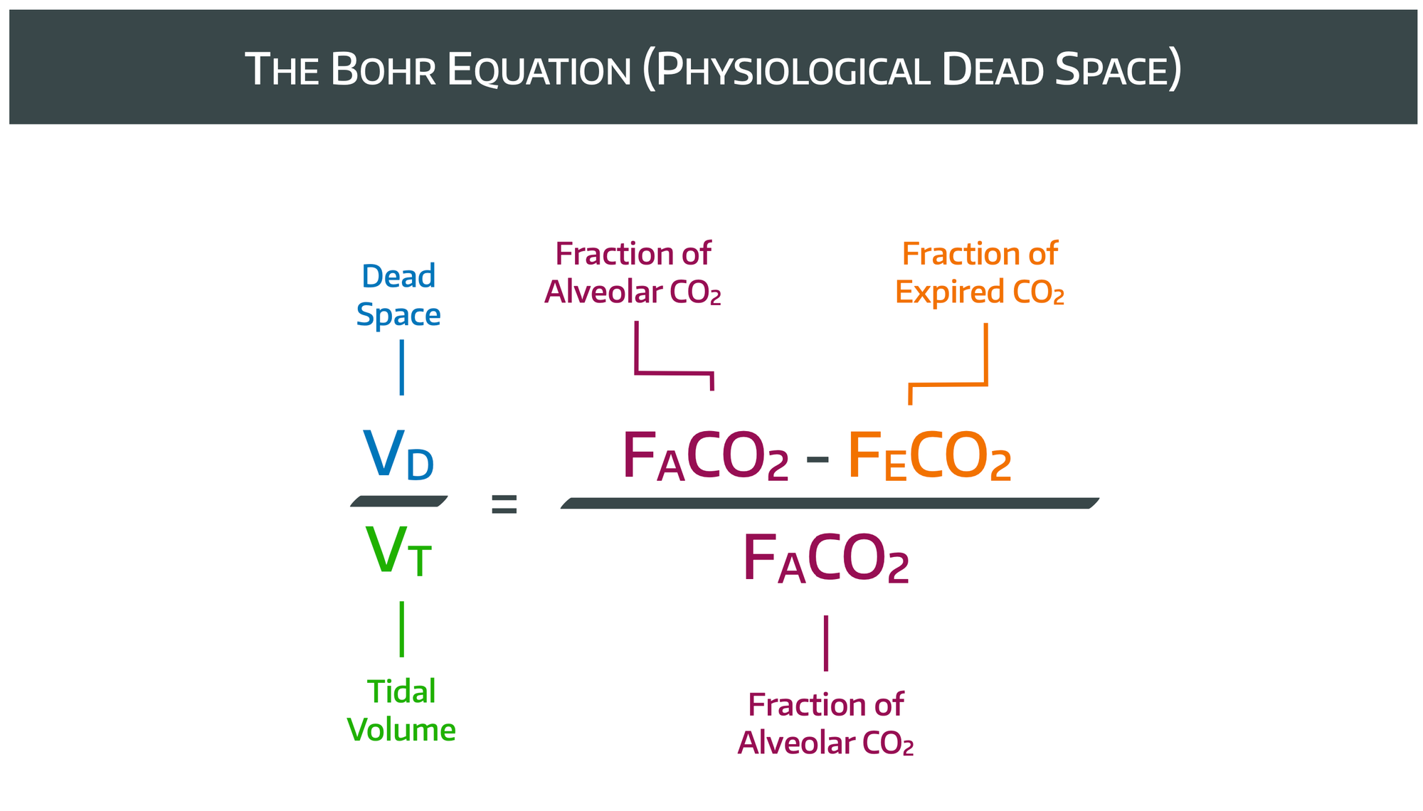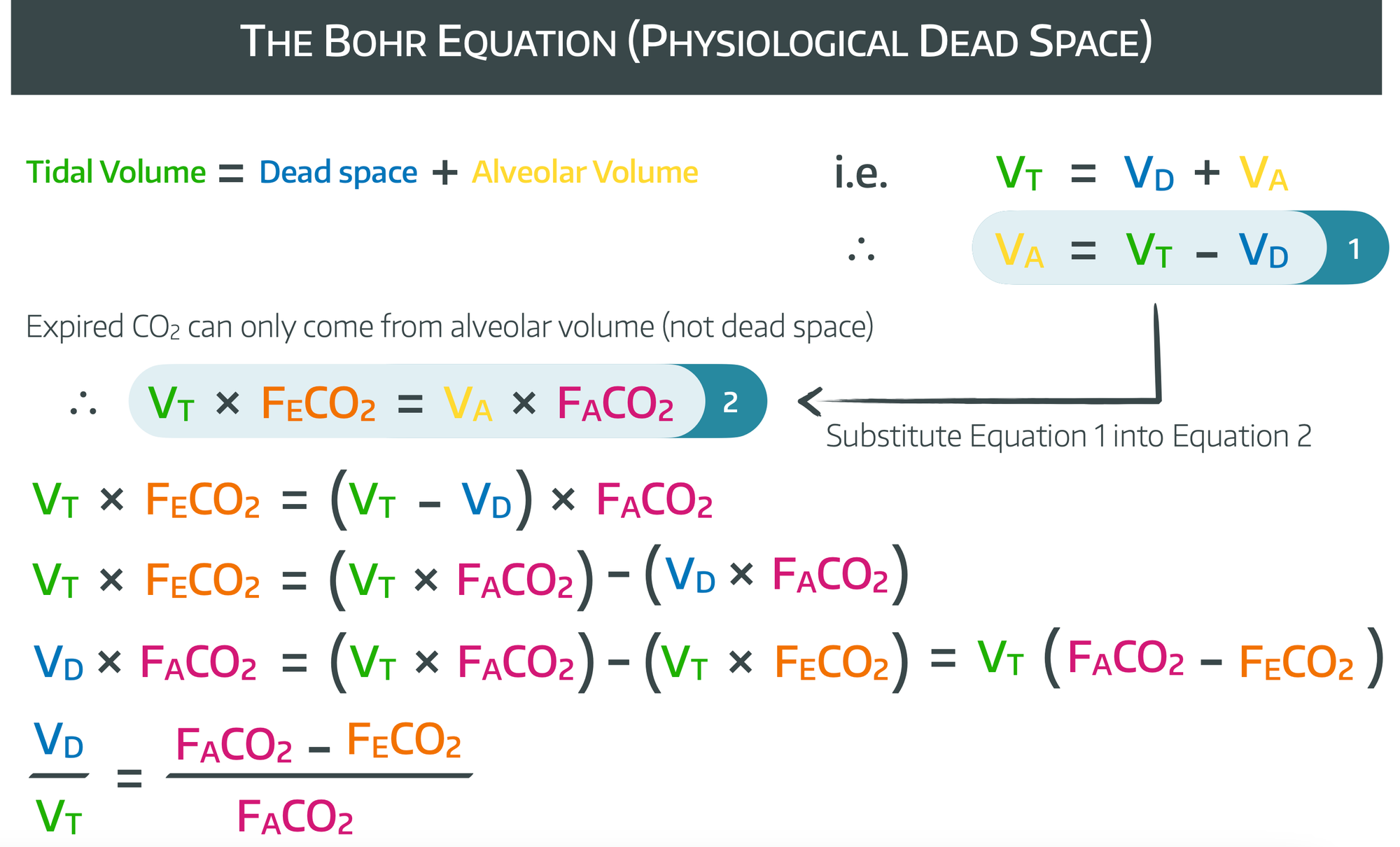 Therefore the entire expired CO2 is only going to be coming from the alveolar ventilation. Therefore we can generate the equations below, and rearrange as demonstrated to form the Bohr equation.