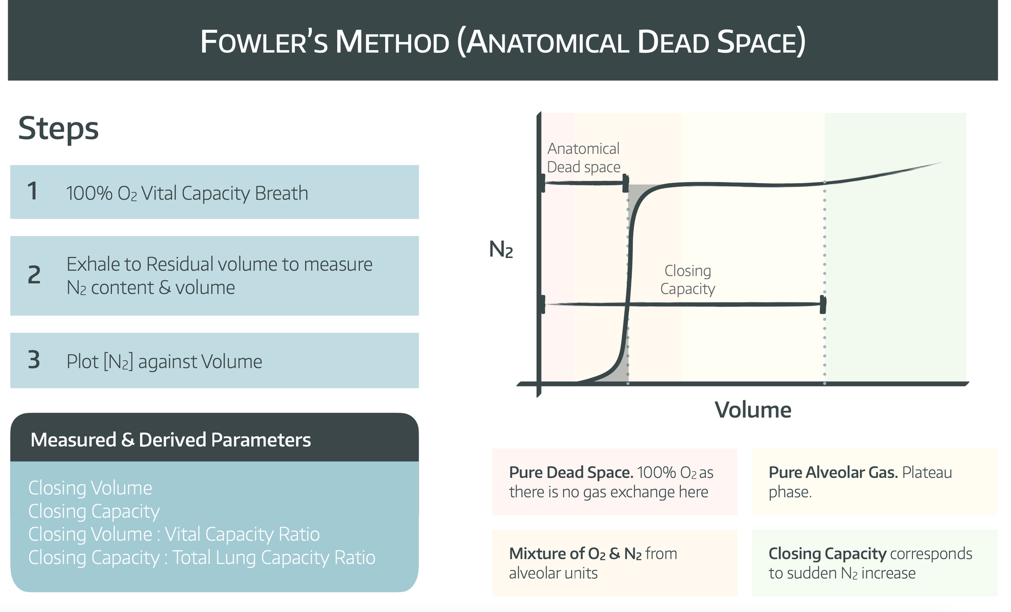 Anatomical dead space is measured using Fowler’s method.