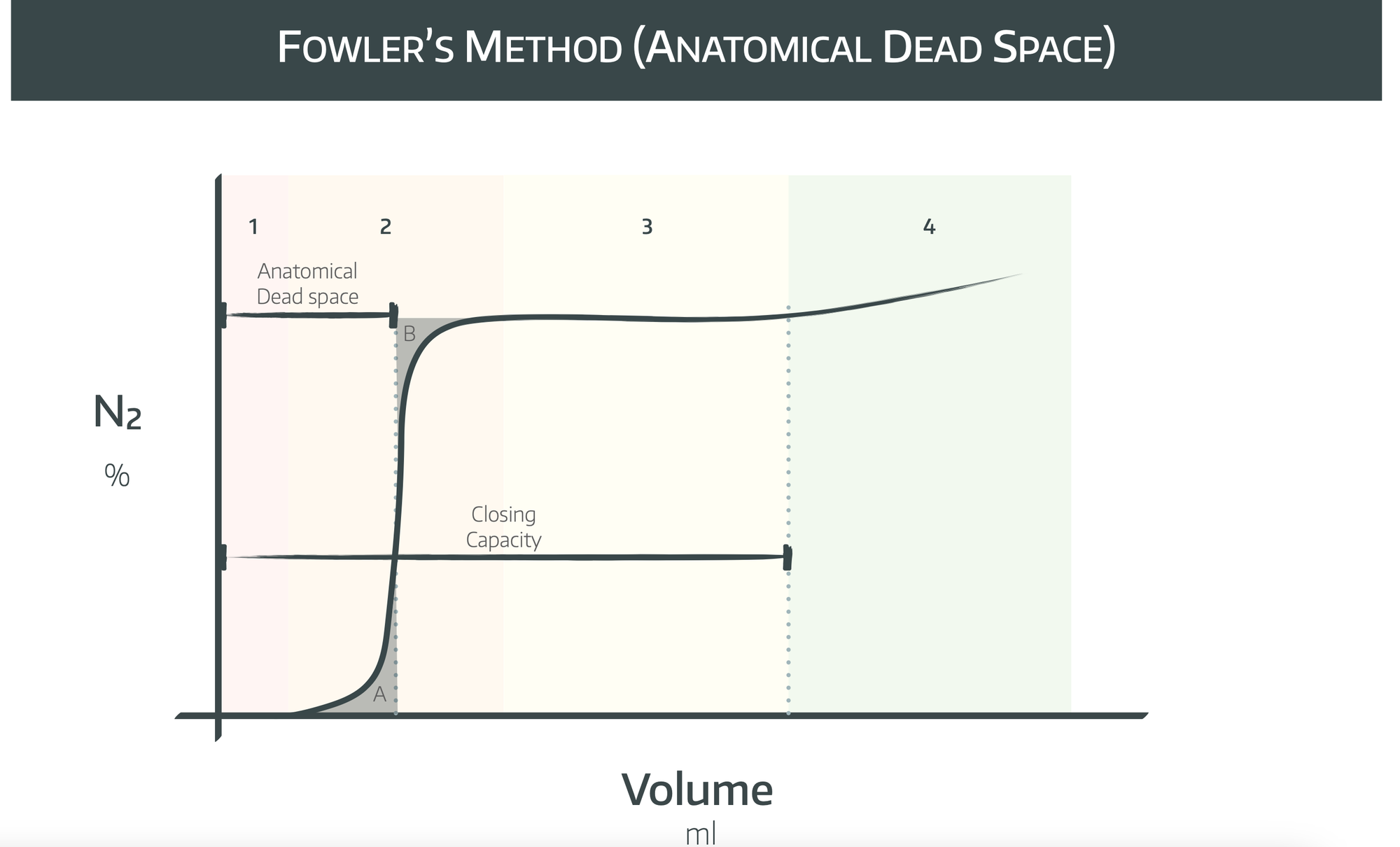 Now draw a vertical line approximately half way through phase 2, such that the highlighted areas A and B are equal. This line cuts through the x axis at the anatomical dead space volume