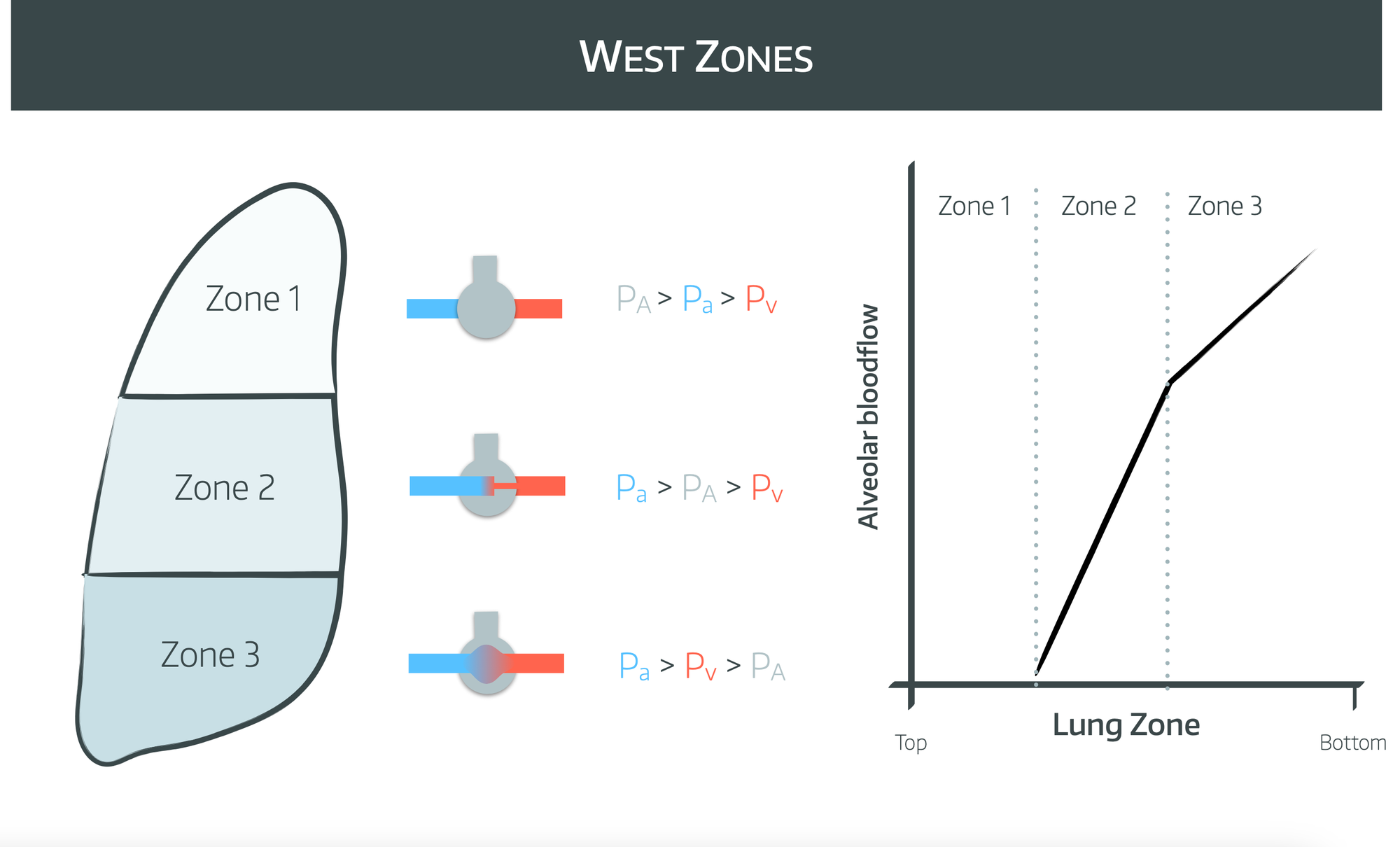 When in the upright position, blood distribution to the different areas is divided into zones called ‘West Zones’. Classically there are three zones described, but a fourth has been added to account for low lung volumes.