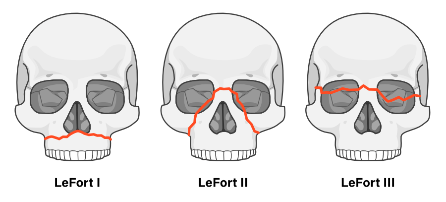 - Entire midface separates from the skull base