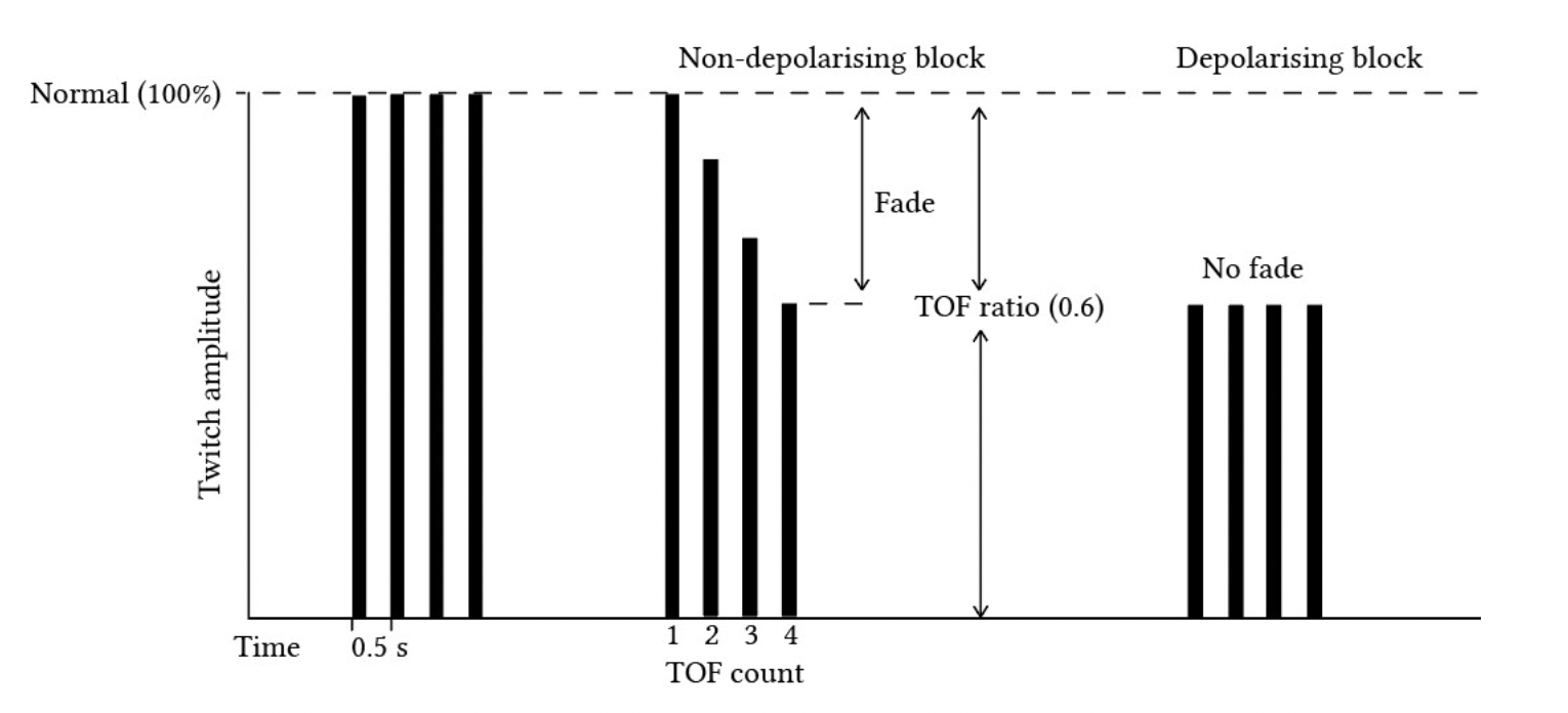 Non-depolarising muscle relaxants demonstrate fade, where sequential neuromuscular impulses decrease in amplitude as a result of pre-synaptic receptors being blocked as well.