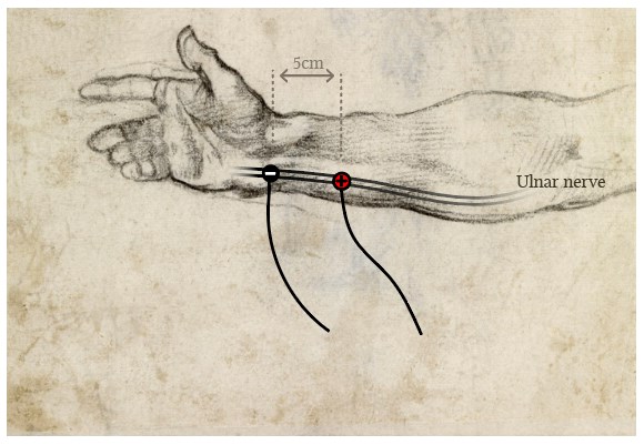 The plan is to induce an action potential that will be transmitted along the nerve to the muscle, the activity of which will then give us an indication of how active the neuromuscular junction is.