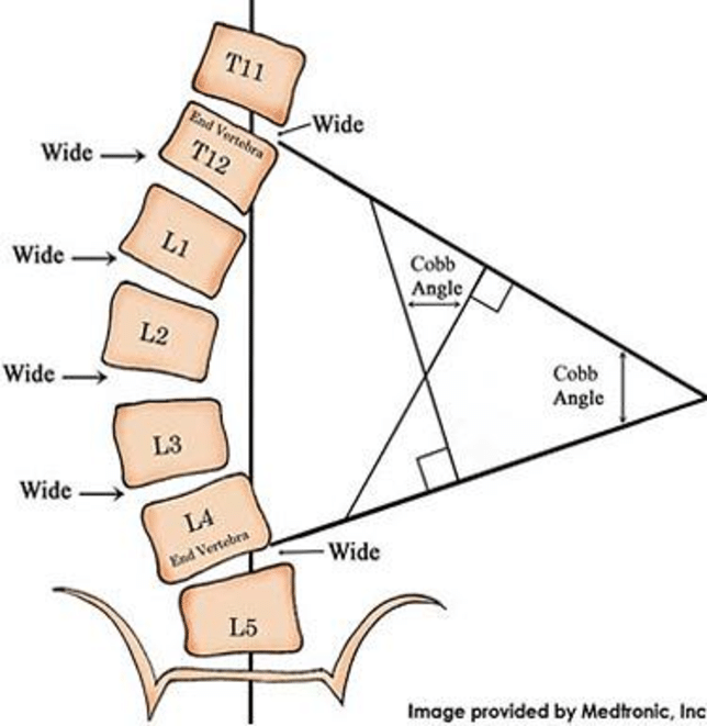 It is generally diagnosed clinically and confirmed radiographically by measuring the Cobb angle, which is the angle subtended by the bodies of the vertebrae at the top and bottom of the greatest degree of curvature, as per the image below.